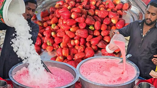 Оригинальный клубничный молочный коктейль 🍓 приготовление клубничного сока с льдом, уличная еда Карачи