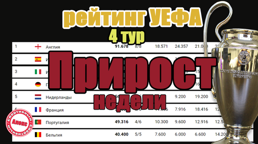 Таблица УЕФА после 4 тура ЛЧ, ЛЕ, ЛК. Россия сохраняет позицию.