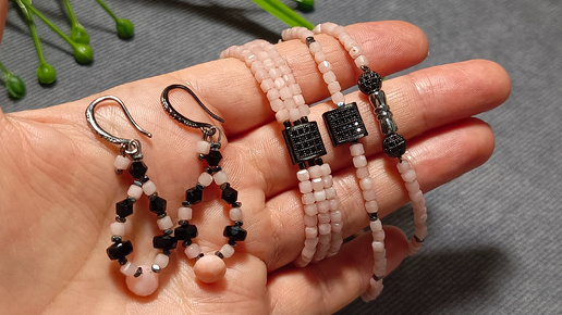Три украшения из двух нитей опала. #идеиукрашений #розовыйопал #браслет #чокер