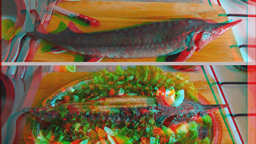 3D stereo red-cyan Севрюга в духовке с картофелем
