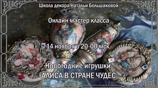 Новогодние игрушки "Алиса в стране чудес" декупаж проморолик Школа декора Натальи Большаковой
