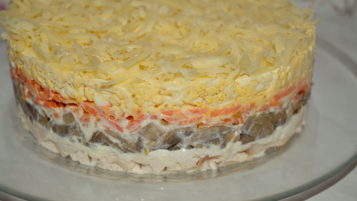 Слоёный салат с курицей и грибами