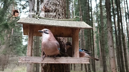 Две сойки в лесу у кормушки.