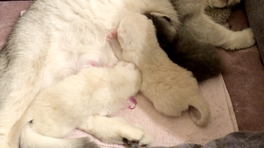 Малыши кушают, нам 8 дней. Мальчики сосут активно молочко, девочка спит у мамы кошки Кайли под головой.