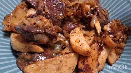 Печень индейки с айвой и яблоками, в карамельном луке#печеньиндейки