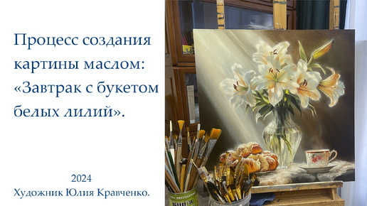 Процесс создания картины маслом на холсте "Завтрак с букетом белых лилий"