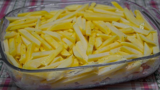 Простой ужин из картошки: нарезаю картошку брусочками и запекаю в духовке с мясом.