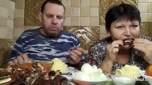 Мукбанг. Пюре с крылышками домашнего копчения. Аджика и купоренные помидоры. Очень вкусно 😋👍.