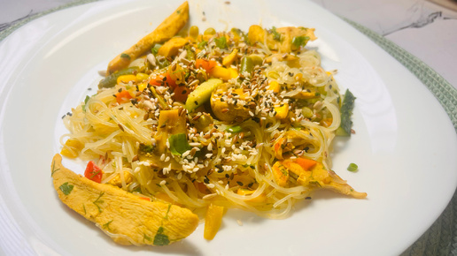 Обед на скорую руку. Для ПП тоже подойдёт. Быстро, вкусно. Фунчоза с филе, грибами и овощами. Готовим стеклянную лапшу.