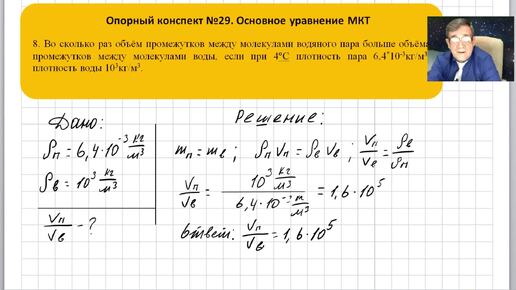 Физика ОК 029 Задача 8 Основное уравнение МКТ. Во сколько раз объём промежутков между молекулами водяного пара больше объёма промежутков ...