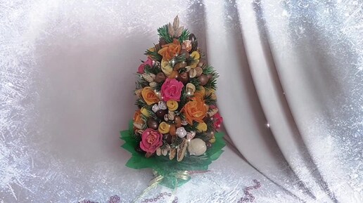 Сухофруктово- ореховая елочка с цветами из хурмы и яблок