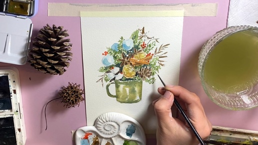 Рисуем на тему «Новый год». Простой рисунок для открытки. Кружка с еловыми лапками
