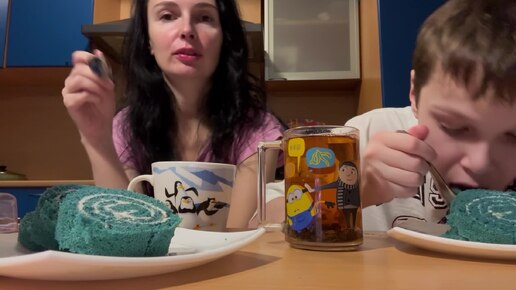 Мукбанг с Тиффани 😺 Голубой рулет 🩵с лавандой🪻 и нежным сливочным кремом 😋 Угостили кису🐈⬛ Вместе веселей. 🌈Нет войне!🌏🌞