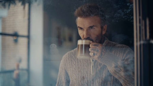 Дэвид Бэкхем играет в футбол со снеговиком в рождественской рекламе кофе