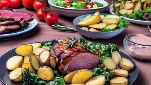 Салат, жареная картошка и мясо на столе, создано с помощью нейросети