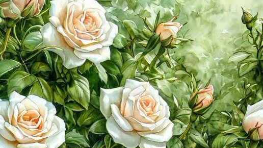 Искусство акварели. Белые розы в туманном пейзаже. Откройте для себя тонкую прорисовку, гипердетализацию и пастельные тона.