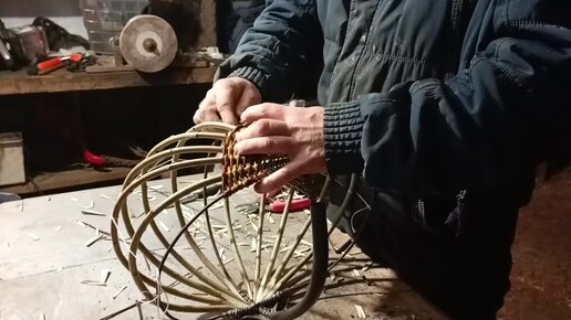 Установка ребер жоскости на пятую корзину. Оплетание каркаса корзины и его фиксация.