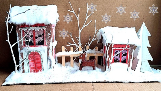 Как сделать зимнюю Новогоднюю композицию из молочных пакетов. Зима в деревне.