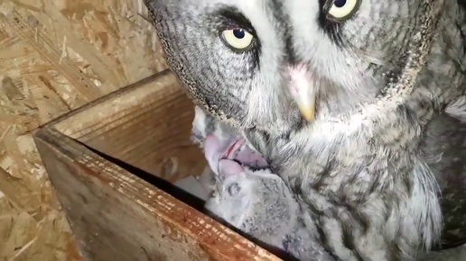 Кормление совят бородатой неясыти. Great Grey Owl feeds owlets.