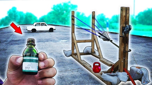 Стреляем из гигантской рогатки различными снарядами. Мега-челлендж: стрельба по машине на разном расстоянии
