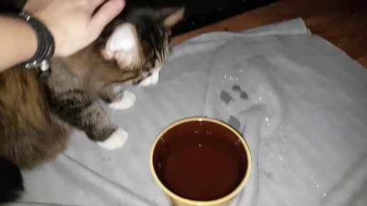 Кот Мурлок играет с водой.