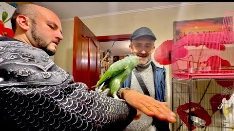 Я первый раз беру на руку попугая Гошу, он очень милый птиц)))