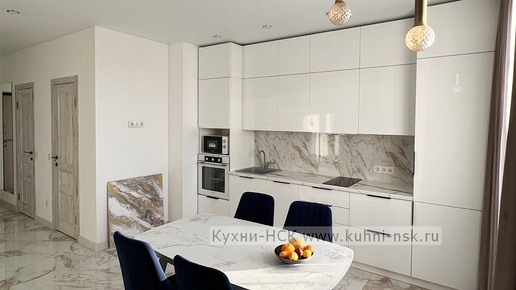 Элегантная Белая Кухня AGT: Прямые Линии, Черные Ручки и Встроенная Техника в кухне-гостиной 20 кв.м