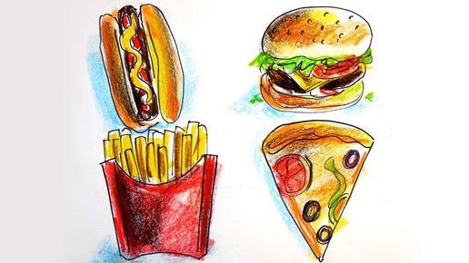 Как нарисовать ХОТ ДОГ, БУРГЕР, ПИЦЦУ, КАРТОШКУ / вредный урок рисования для детей