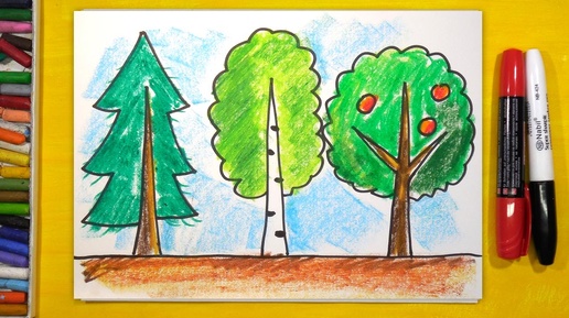 Как нарисовать 3 Дерева (Ель, Березу, Яблоню), Урок рисования для детей от 3 лет