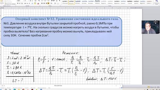 Физика ОК 032 Задача 1 Уравнение состояния идеального газа. Давление воздуха внутри бутылки закрытой пробкой, равно 0,1МПа при температур...