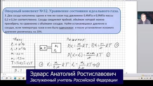 Физика ОК 032 Задача 3 Уравнение состояния идеального газа. ва сосуда наполнены одним и тем же газом под давлением 0,4МПа и 0,9МПа массы...