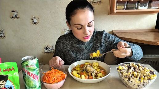 Мукбанг🍲Тушёная картошка🥗салат с фасолью и кукурузой. Нужно ли менять что-то в себе, если всё устраивает? 🤔