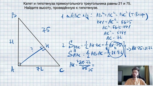 №5. Катет и гипотенуза прямоугольного треугольника равны 21 и 75. Найдите высоту, проведённую к гипо