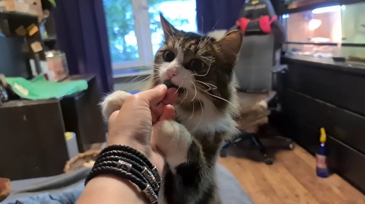 Заботушка! Кот Мурлок кормит гусеницами дракона Блинца