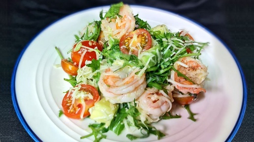 Салат с авокадо, руколой, помидорками черри и жареными креветками 🥗 🍤