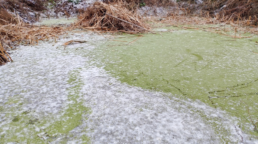 Измеряю глубину воды в прудике, делаю лунки для карасей, скашиваю лишнюю растительность