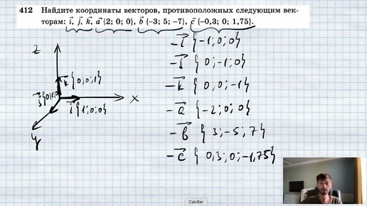 №412. Найдите координаты векторов, противоположных следующим векторам: i, j, k, а {2; 0; 0}, b { — 3