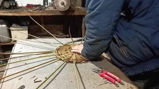Плетение 4к круглой корзины часть 2. Отличная корзина из колотого прута. Загибка в три прута. Разноцветная корзина.