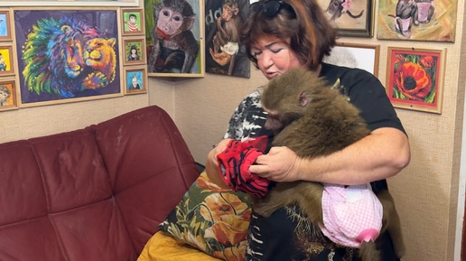УДИВИТЕЛЬНО! Обезьянка Люся СПОКОЙНО одевается на руках у мамы Тани!