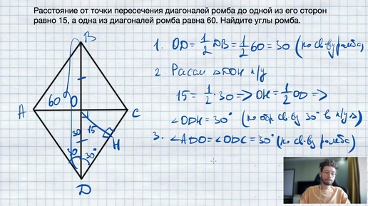 №2. Расстояние от точки пересечения диагоналей ромба до одной из его сторон равно 15, а одна из диаг