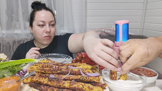 Мукбанг с мужем) Люля-кебаб, овощи, зелень и вкусные лепешки с сыром и зеленью.