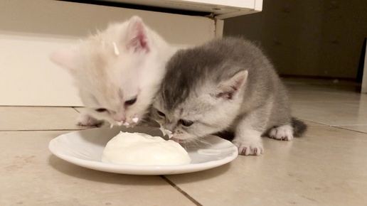 Котятам кошки Кайли 29 дней. Первый прикорм. Творожок.