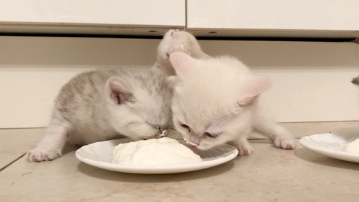 Котятам кошки Кайли 29 дней. Первый прикорм. Творожок.