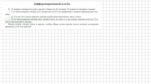 ЕГЭ Экономические задачи. Занятие 3. Дифференцированный платеж. Задача 1.