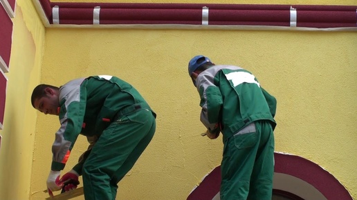Нанесение камешковой декоративной штукатурки на фасад дома, затирка пластиковыми тёрками
