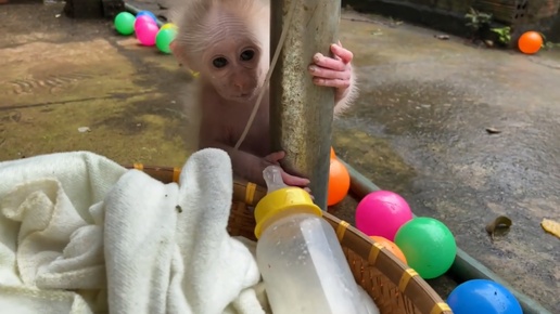 Маленькие и очень милые обезьянки играют и кушают на детской площадке