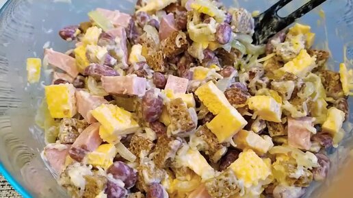 Рецепт из студенческих времён: салат из фасоли с колбасой и сухариками