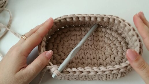 Мастер класс "Люлька для куклы 15 см из трикотажной пряжи Бисквит". Связала 3 и 4 ряды, приступила к 5 ряду и ручкам.