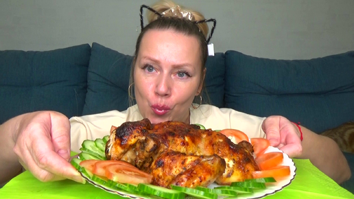 Мукбанг курица загорелая запеченная в духовке и овощи. еда.