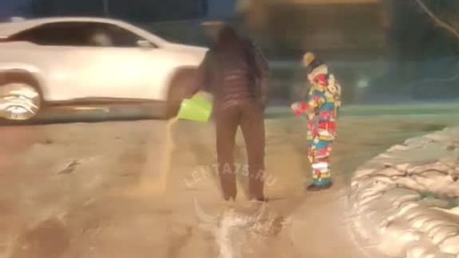 Мужчина с ребёнком подсыпали обледеневшую дорогу на Советской в Чите